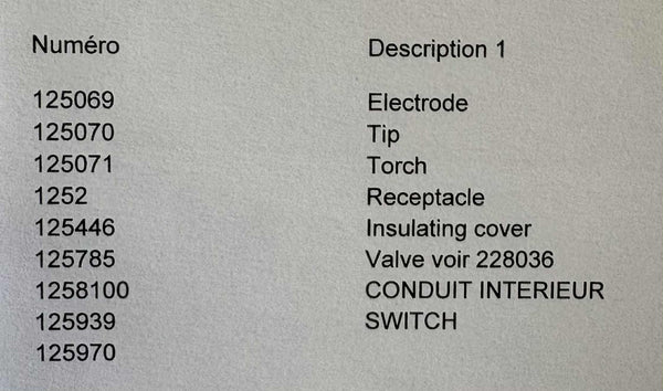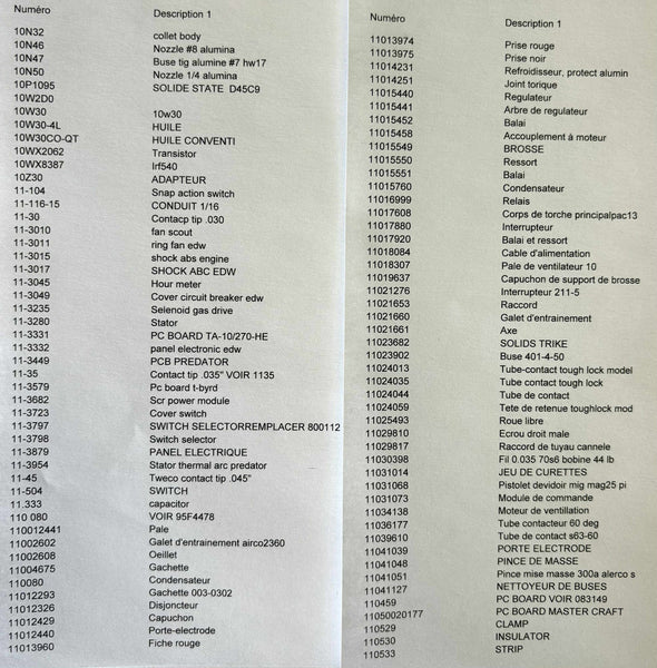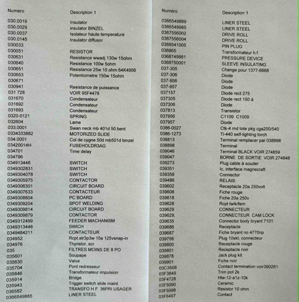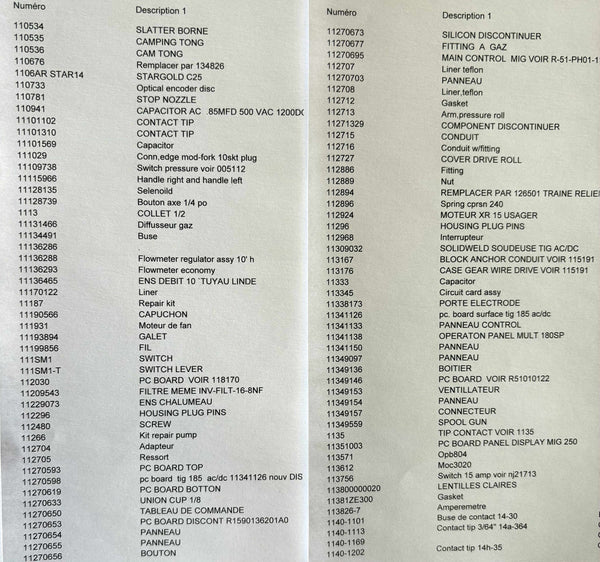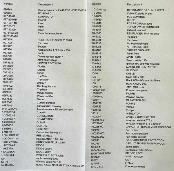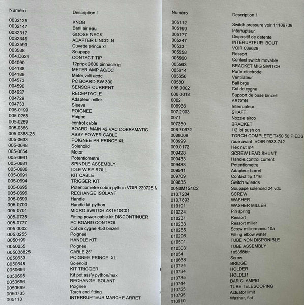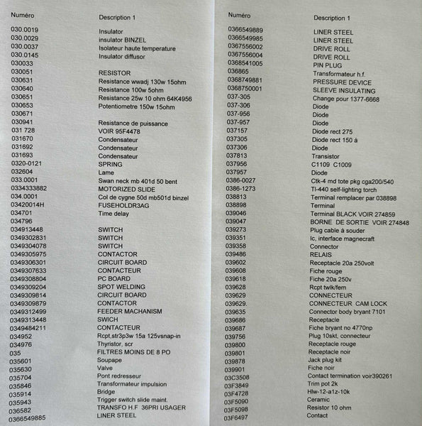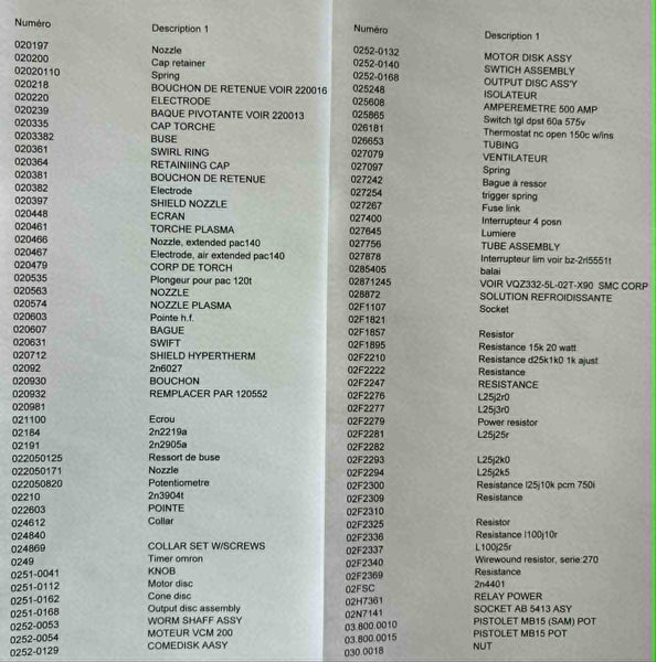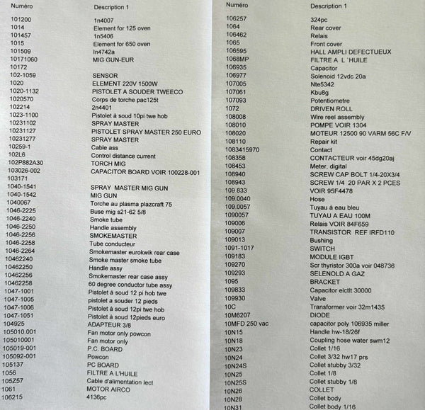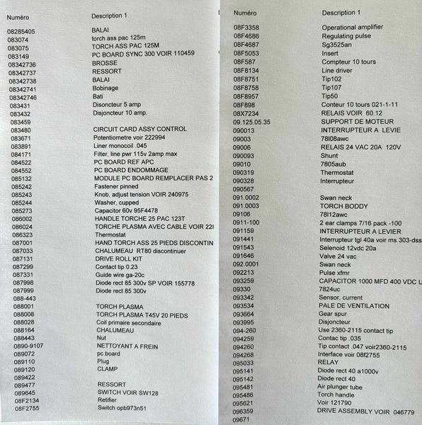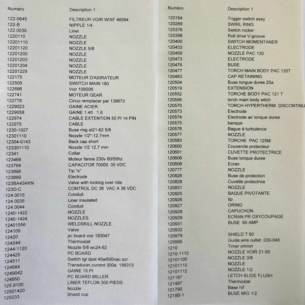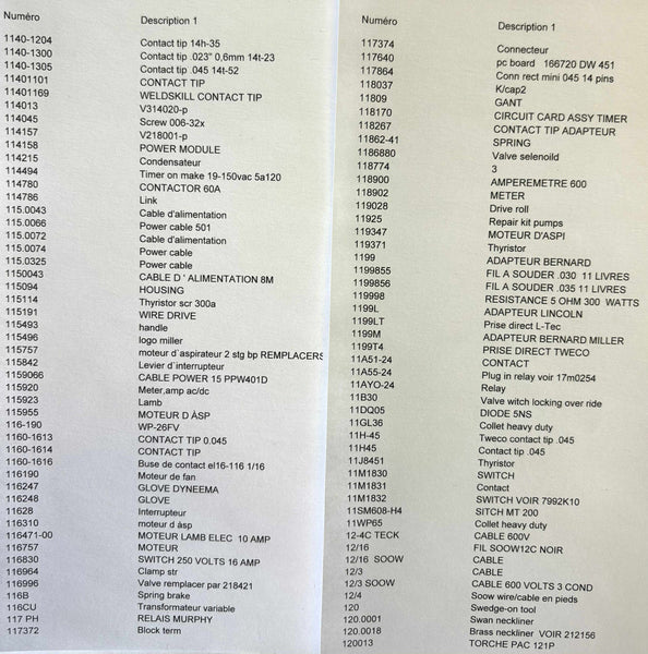 Découvrez ici notre inventaire de pièces neuves et usagées numérotées de 000067 à 125970 pour équipements Miller, Lincoln, ESAB, Hypertherm, Thermadyne et Powcon.